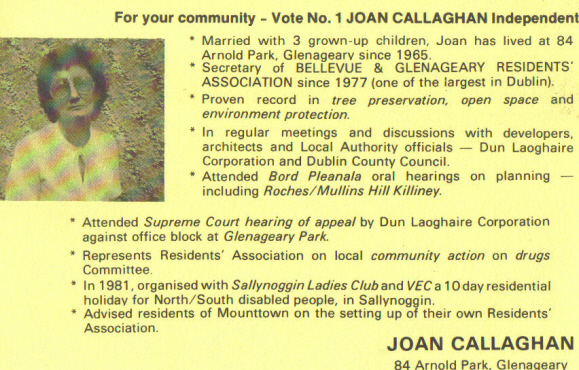 In case people think ‘greedy developers’ are a recent phenomenon, Joan gives them a few mentions here. Also the photo with those glasses and lack of smile! Joan polled a couple of hundred votes and failed to be elected.