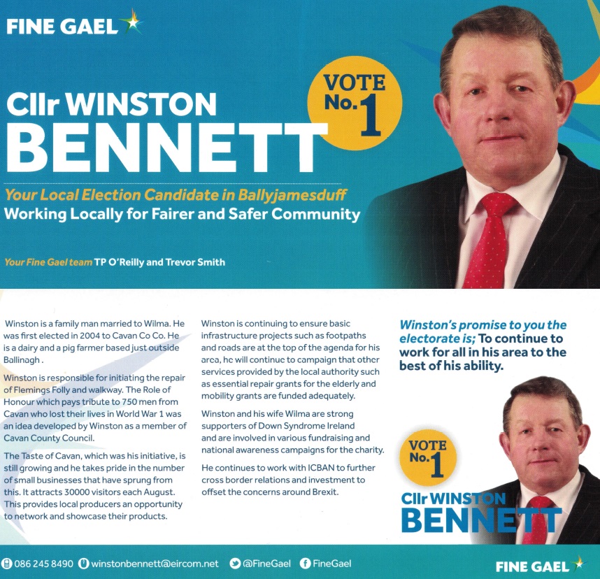 A Leaflet from Winston Bennett of Fine Gael who is running for Cavan County Council in the Ballyjamesduff LEA.