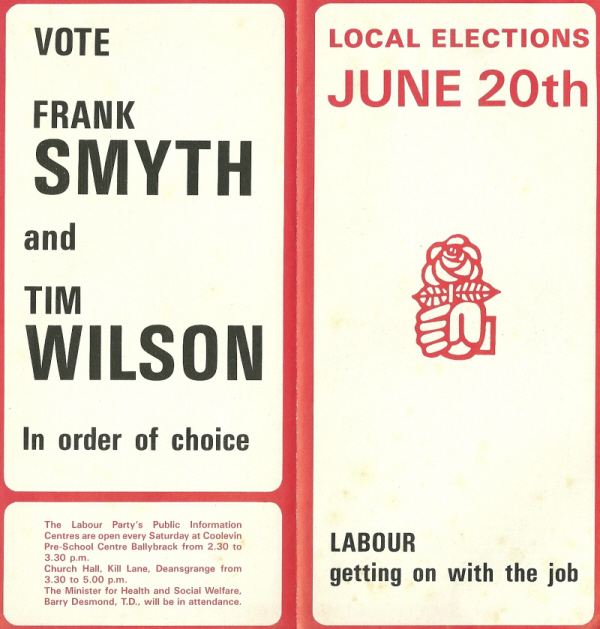 Tags: 1985 Local Elections, Ballybrack, Barry Desmond, Dublin, election flyers, Frank Smyth, Ireland, Irish Politics, Labour Party, Tim Wilson