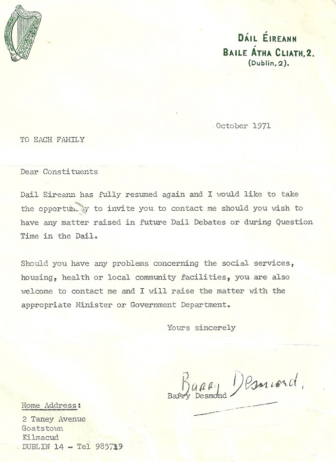 From October 1971 a letter from then Labour TD for Dun Laoghaire , Barry Desmond to constituents.