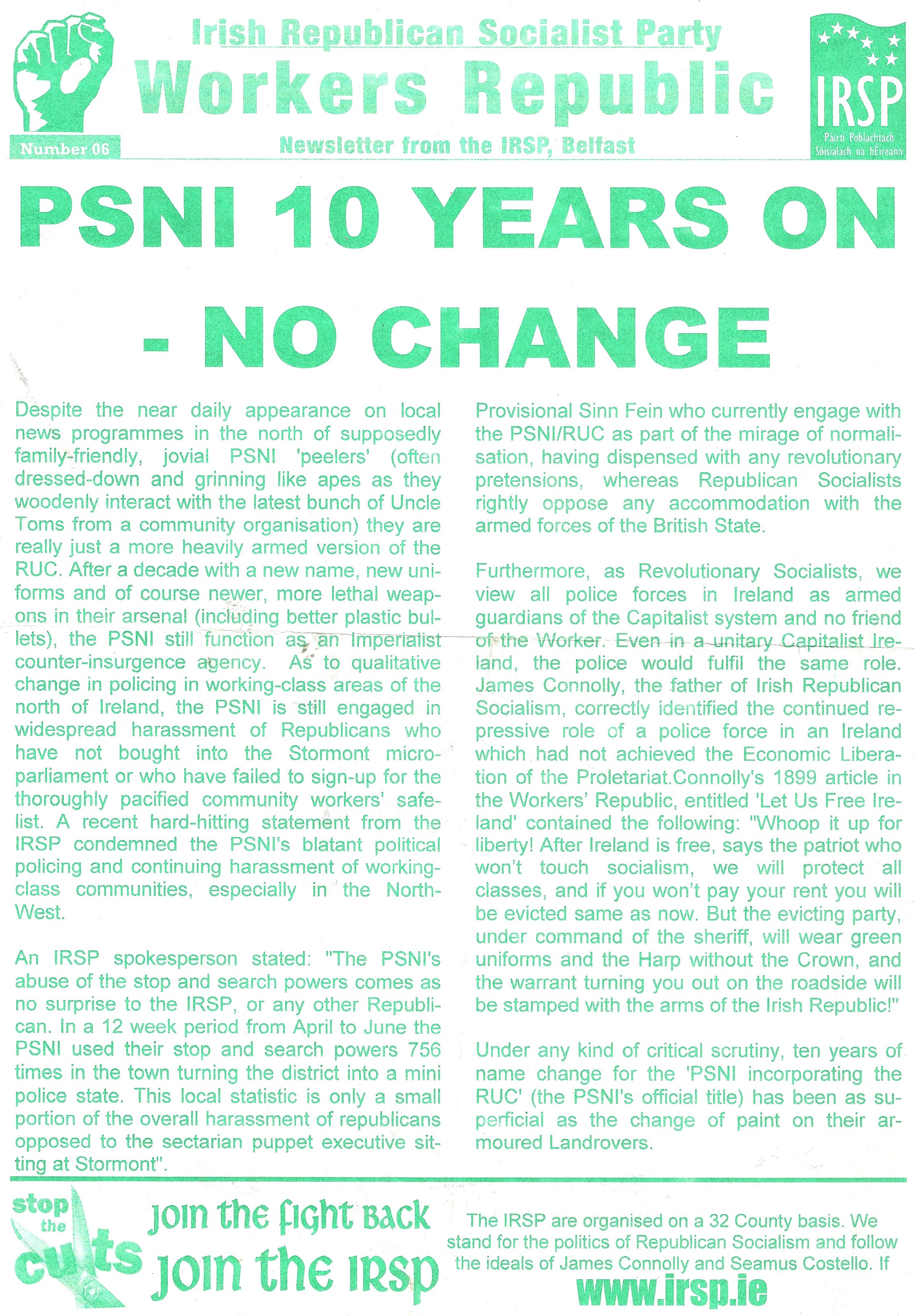 From November 2011 an edition of “Workers Republic”, the newsletter of the Belfast IRSP.