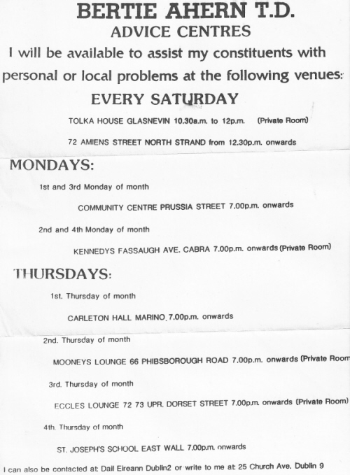From 1986 or so a leaflet detailing the Advice Centres of Bertie Ahern TD.
