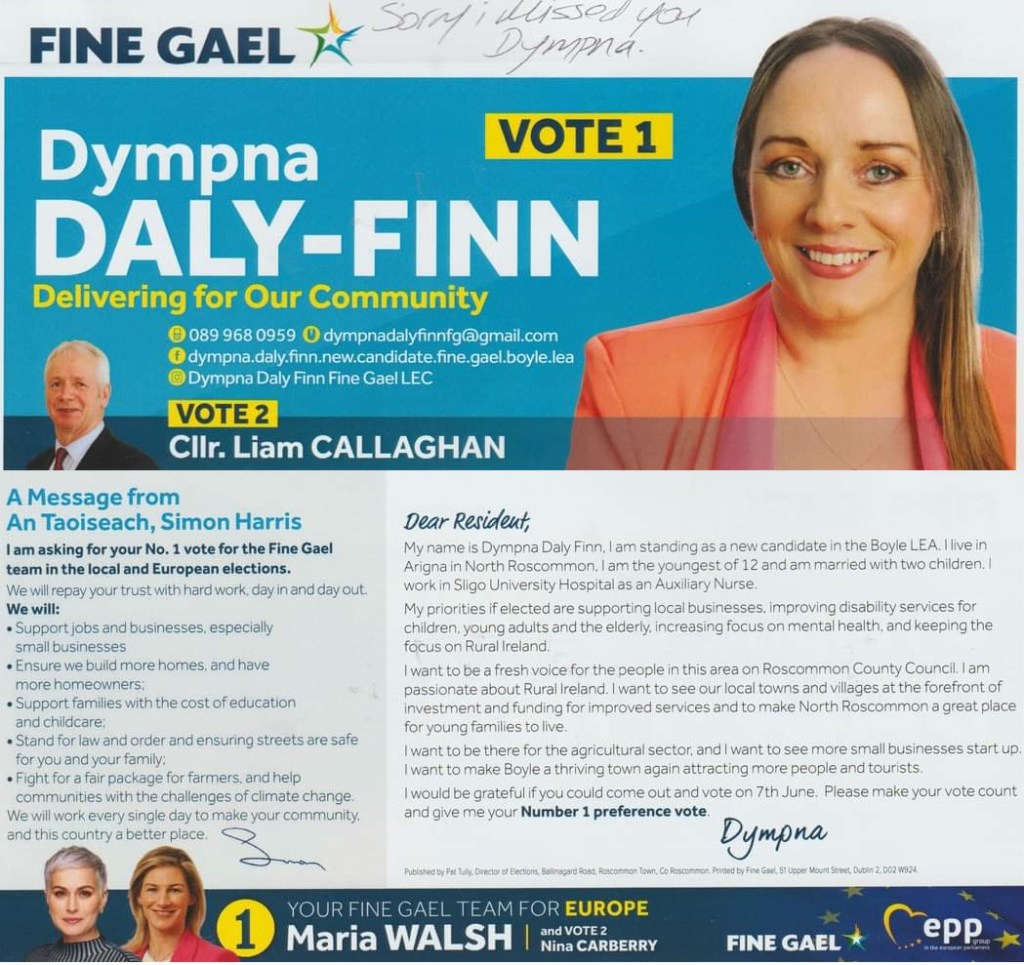 A leaflet from Dympna Daly-Finn who is running for Fine Gael in Boyle in the 2024 Local Elections.