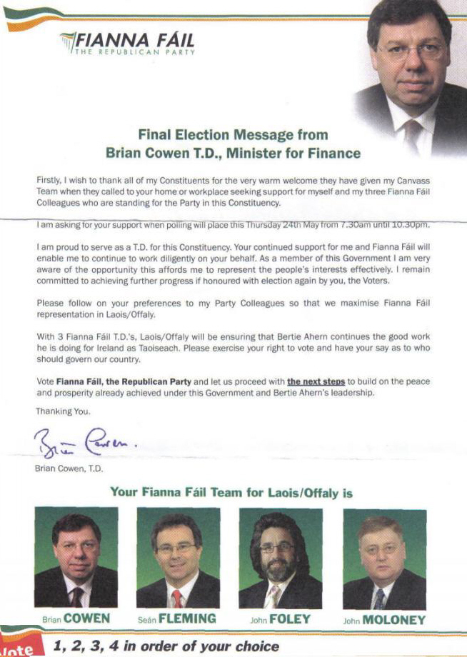 From the 2007 General Election A leaflet promoting Laois Offaly Fianna Fail candidates Brian Cowen, Sean Fleming, John Foley and John Moloney. All but John Foley were elected.
