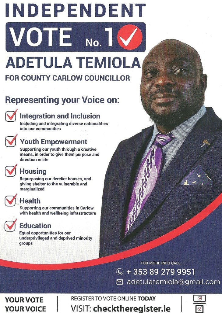 A leaflet from Adetula Temiola who is running as an Independent in the Carlow LEA in the 2024 Local Elections