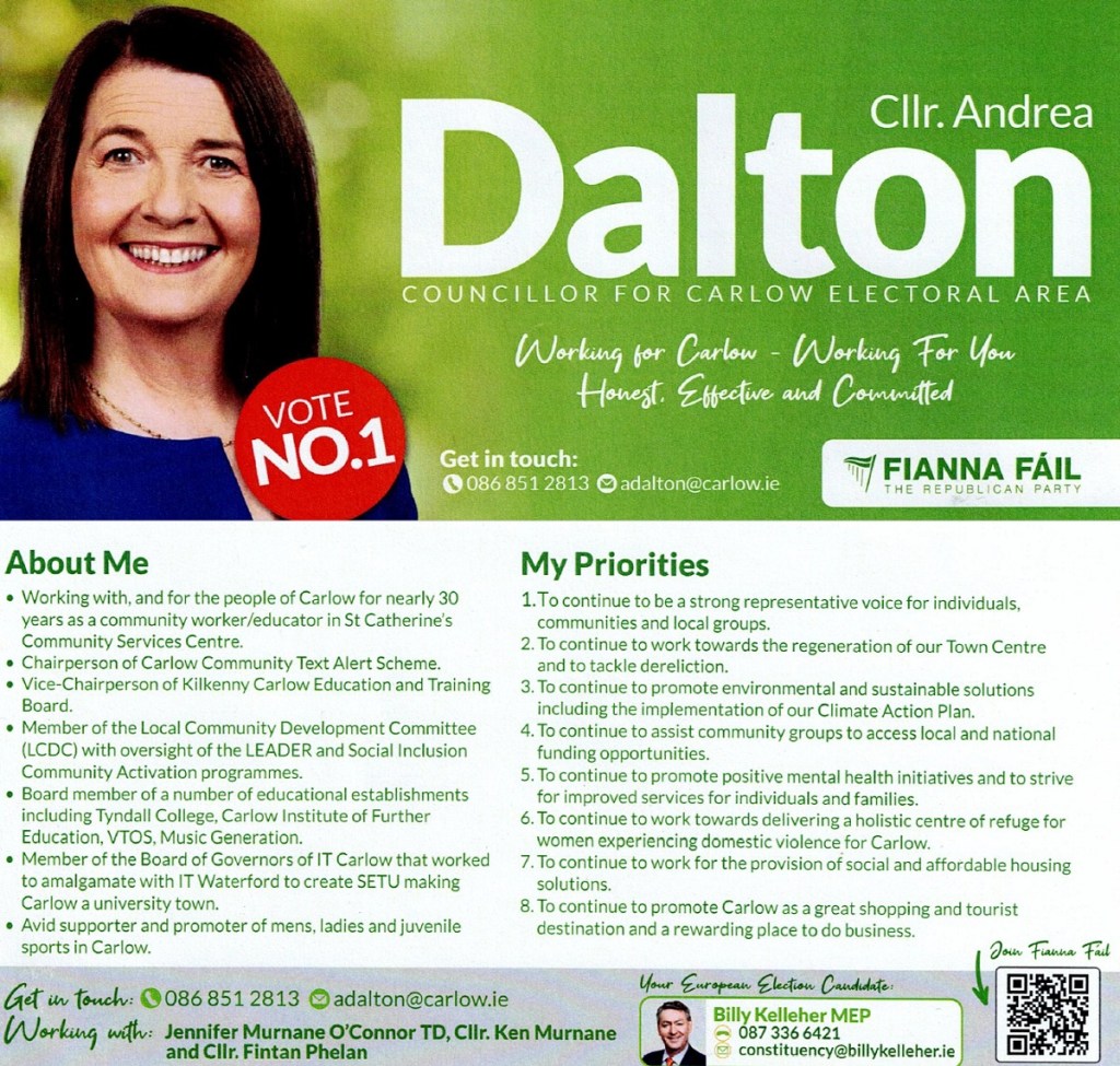 A leaflet from Andrea Dalton who is running for Fianna Fáil in the Carlow LEA in the 2020 Local Elections