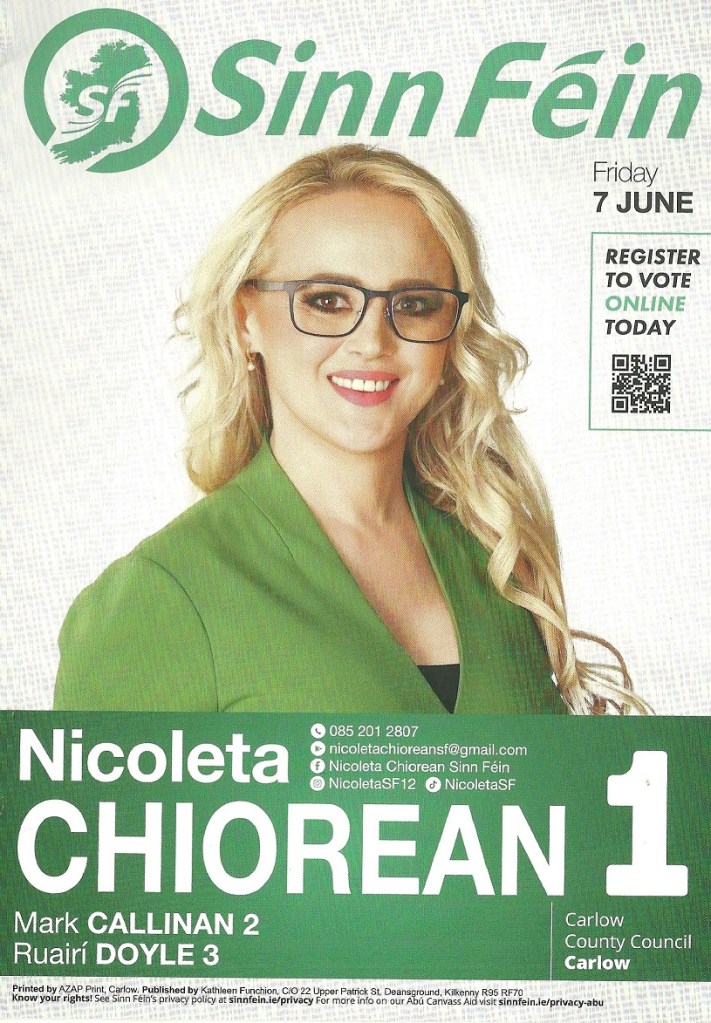 A leaflet from Nicoleta Chiorean who is running for Sinn Féin in the 2024 Local Election in the the Carlow LEA.