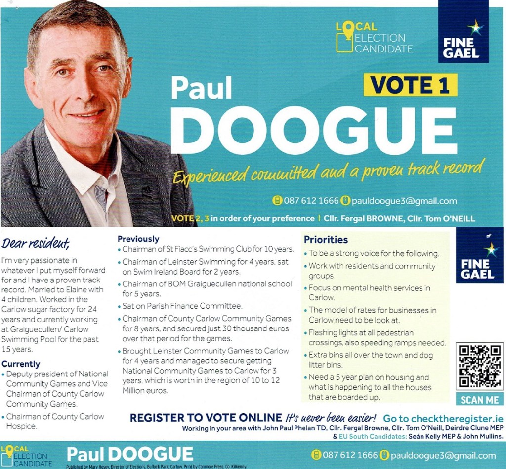A leaflet from Paul Doogue who is running for Fine Gael in The Carlow LEA in the 2024 Local Elections.