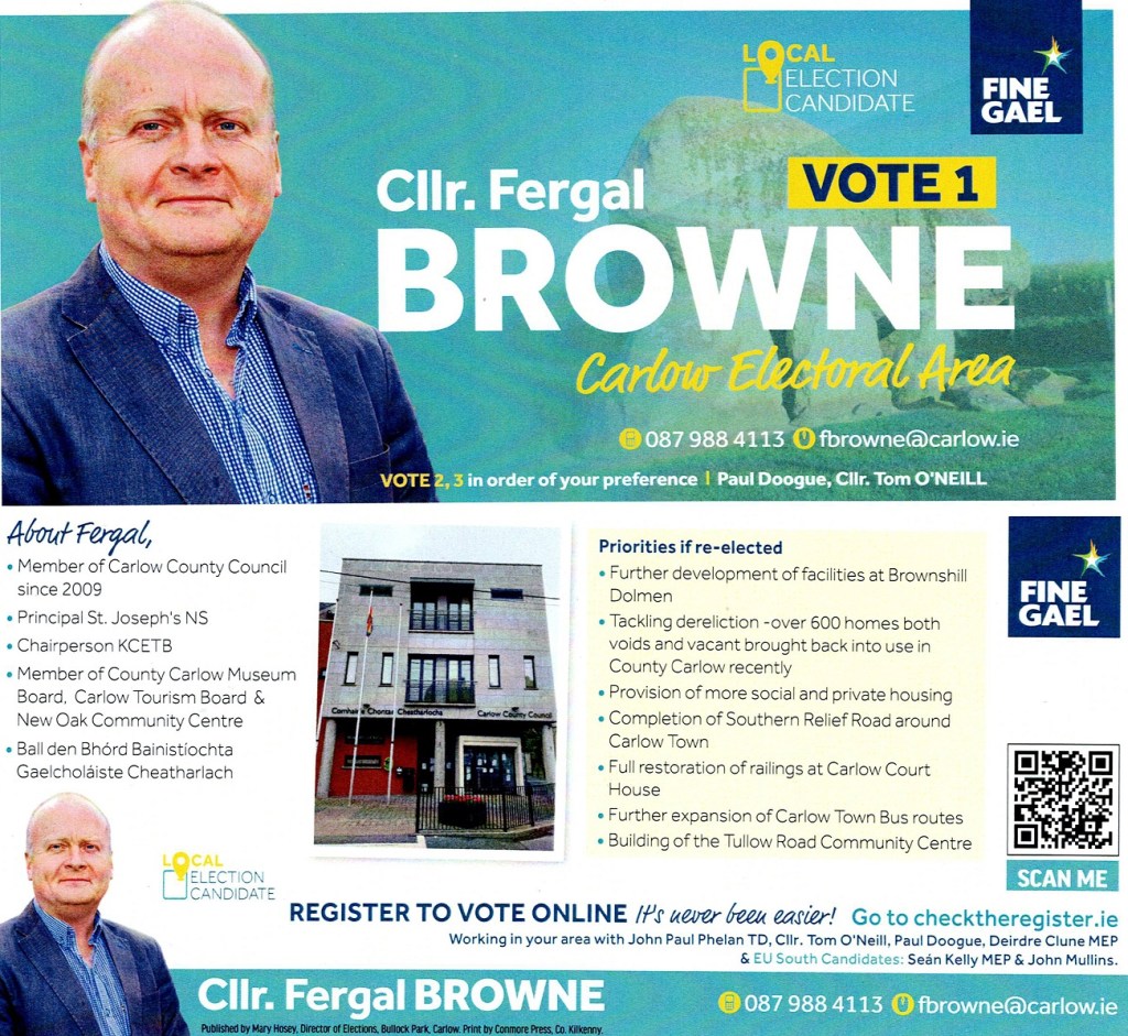 A leaflet from Fergal Browne who is running for Fine Gael in the Carlow LEA in the 2024 Local Elections