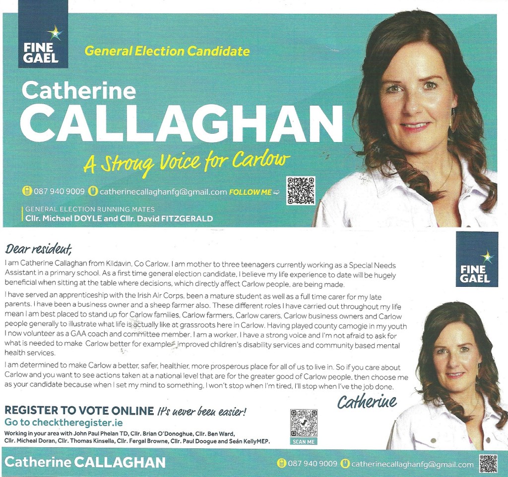 A leaflet from Carlow based Catherine Callaghan who is running for Fine Gael in Carlow Kilkenny in the 2024 General Election.