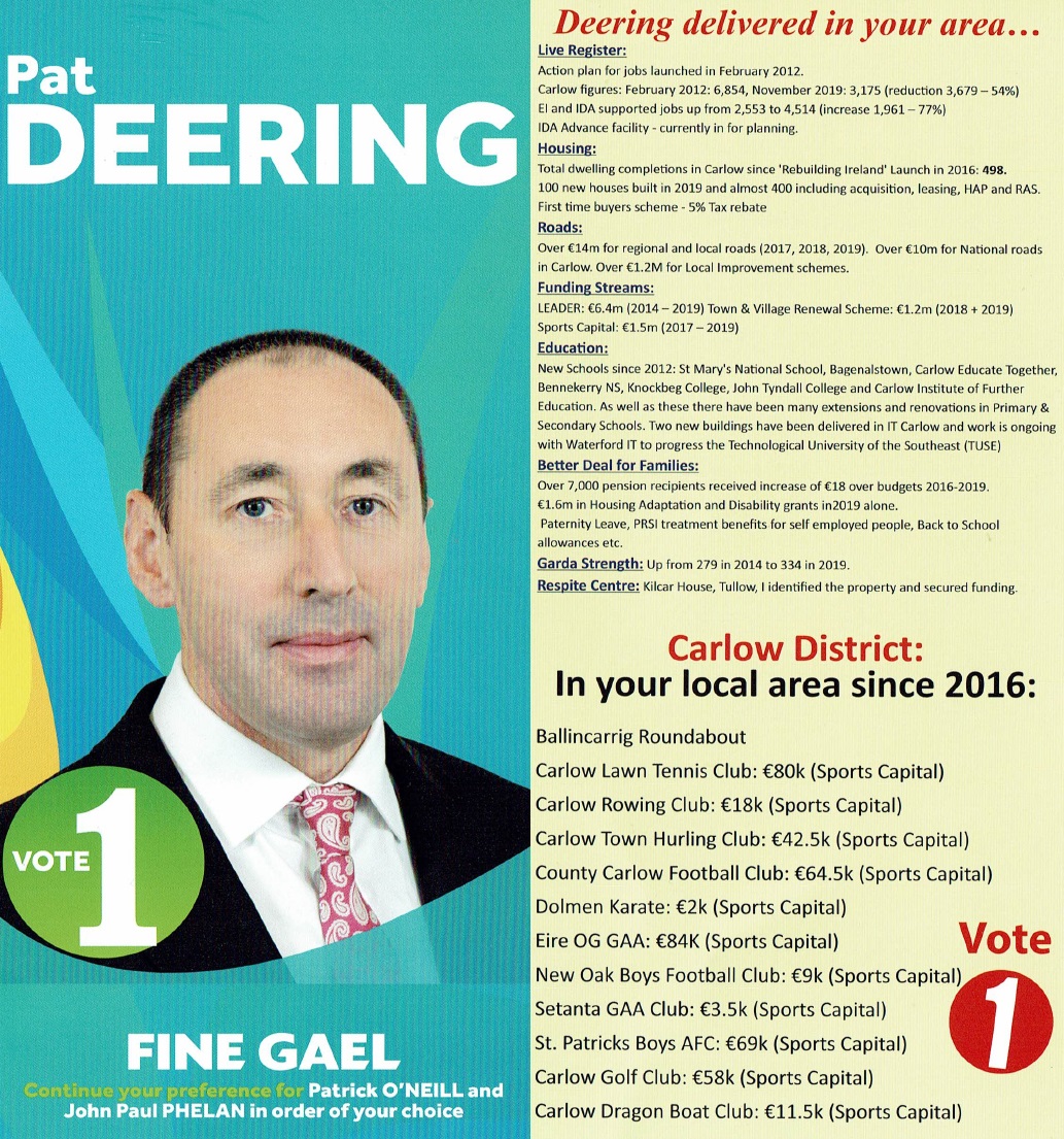 A Leaflet from Pat Deering who is running for Fine Gael in Carlow -Kilkenny in the 2020 General Election