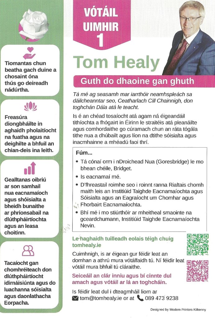 A bilingual leaflet from Tom Healy who is running as an Independent in Carlow Kilkenny in the 2024 General Election.