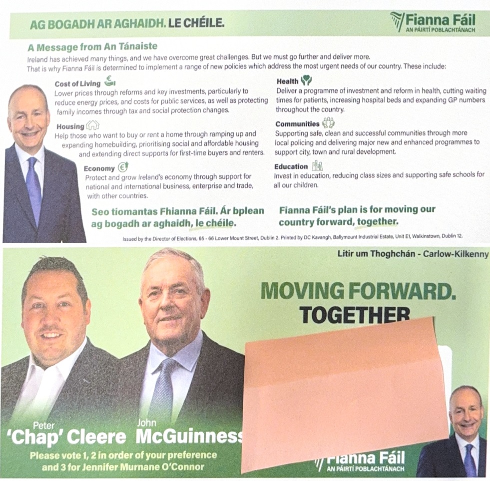 A Leaflet from Peter ‘Chap’ Cleere and John McGuinness who are running for Fianna Fáil in Carlow Kilkenny in the 2024 General Election