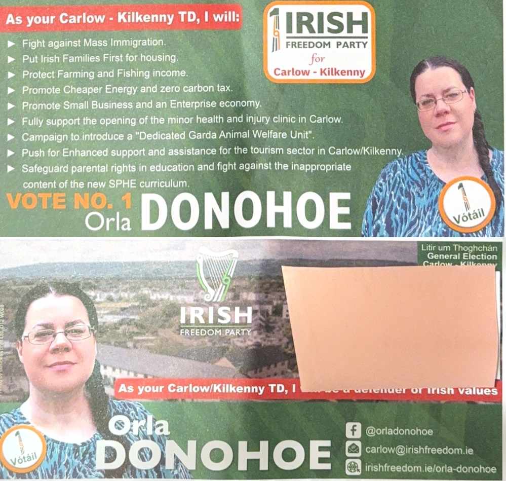 A Leaflet from Orla Donohoe who is running for The Irish Freedom Party in Carlow Kilkenny in the 2024 General Election
