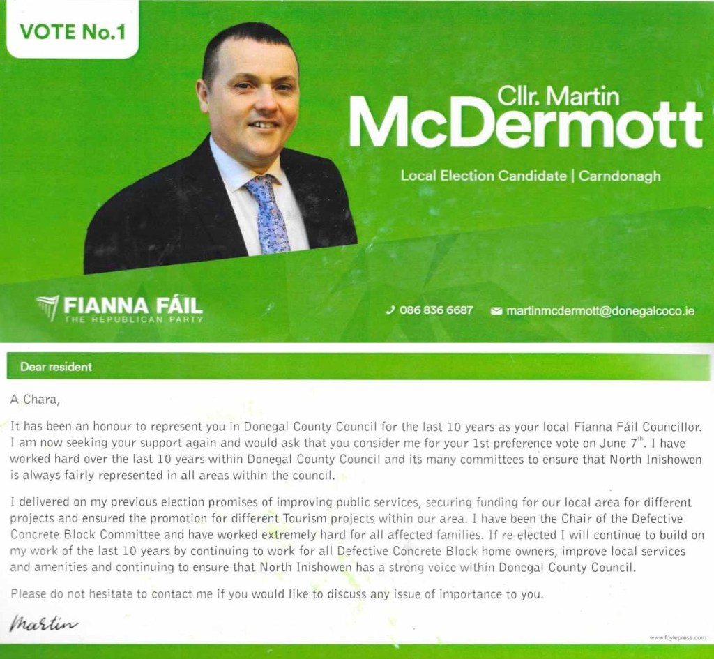 A Leaflet from Martin McDermott of Fianna Fáil running in Carndonagh to retain his seat on Donegal County Council.