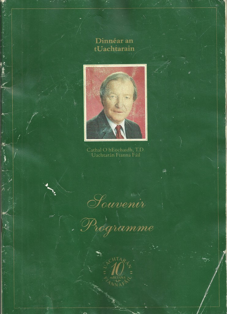 From 1989, The Souvenir Programme for the “Dinnéar an tUachtaráin” to celebrate Charles Haugheys 10 years as leader of Fianna Fáil. Contains a profile, some tributes, the menu, prizes, ads and more. Many thanks to the sender. It’s 44 pages so have uploaded in pdf.