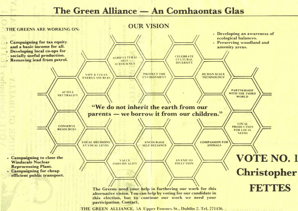 Fettes is a hugely important figure in the Irish Green Party. Not alone was he a founding member of the now Green Party, It was Christopher Fettes who ‘called’ the initial meeting in 1981 that led to the foundation of The Ecology Party… which became the Green Alliance/An Comhaontas Glas and was renamed again as the Green Party/An Comhaontas Glas.