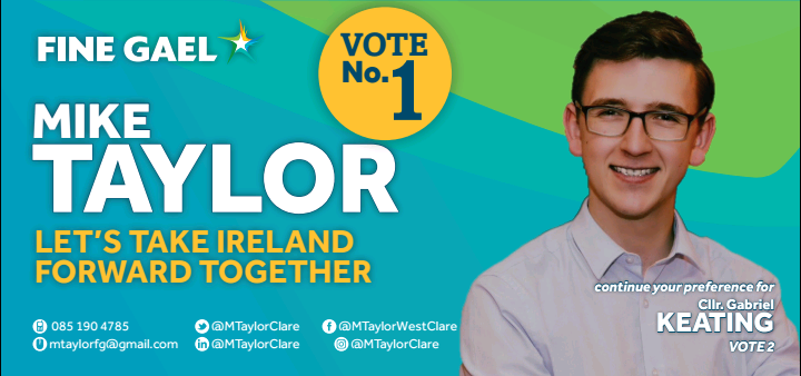 A Leaflet from Mike Taylor of Fine Gael running in The Kilrush LEA for a seat on Clare County Council. He is youngest ever and first LGBTQ candidate there.