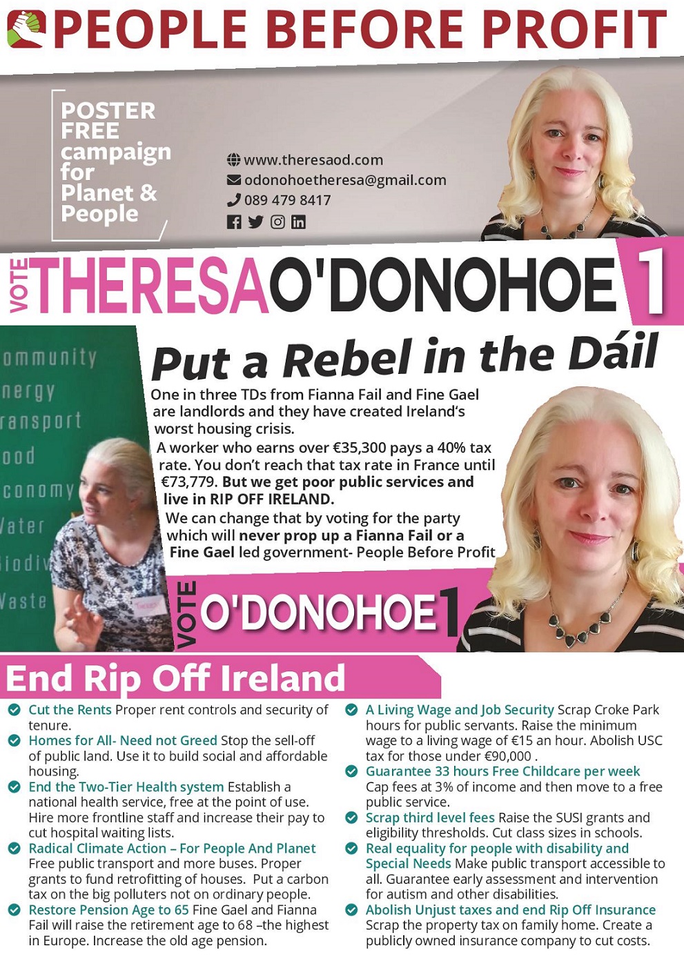 A Leaflet from Theresa O’Donohoe who is running for People Before Profit in Clare.