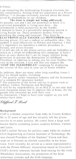 From the 2011 General Election campaign a leaflet from Independent candidate Clifford T Reid running in Kildare South. Reid of “Stop The Paedophiles” fame has been to the Antarctic since his 2004 campaign and plans to conquer Everest in 2013.