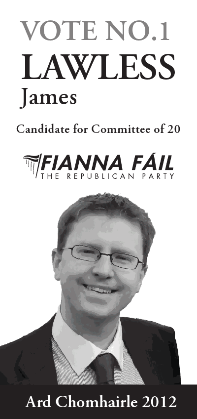 From the campaign for the Committee of Twenty elections at this year’s Fianna Fail Ard-Fheis a leaflet from candidate James Lawless. His Website