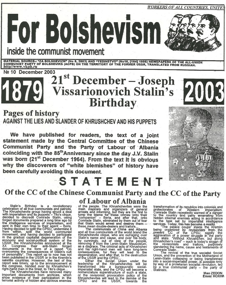 The December 2003 edition of “For Bolshevism- inside the communist movement” produced by The All Union Communist Party of Bolsheviks (ACPB) On The Territory Of The Former USSR. There are a number of articles to mark the Joseph Stalin’s Birthday. I’ve scanned and uploaded it in pdf format here