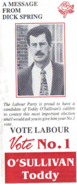 From the 1989 General Election, a leaflet from Labour candidate Toddy O’Sullivan running in Cork South Central.
