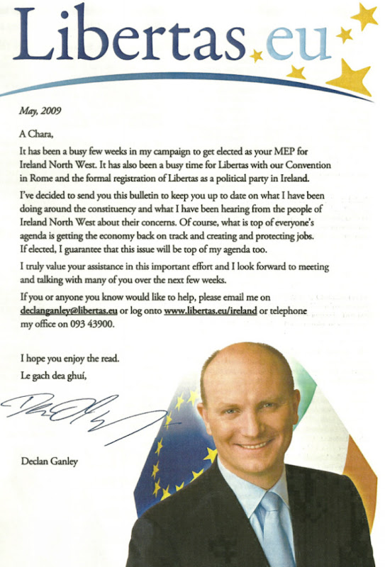 From the 2009 European Elections a leaflet for Libertas Ireland candidate in Ireland North West Declan Ganley. Ganley polled 67,638 votes and missed out on the final seat.