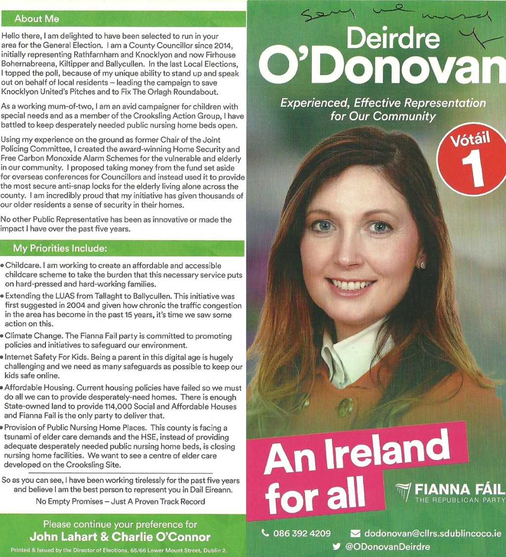 A Leaflet from Deirdre O’Donovan who is running for Fianna Fáil in Dublin South West.