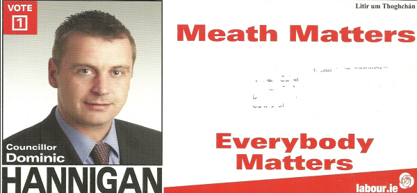 From the 2005 Meath by Election a flyer for Labour candidate Dominic Hannigan. Hannigan polled 5567 votes and failed to win the seat.
