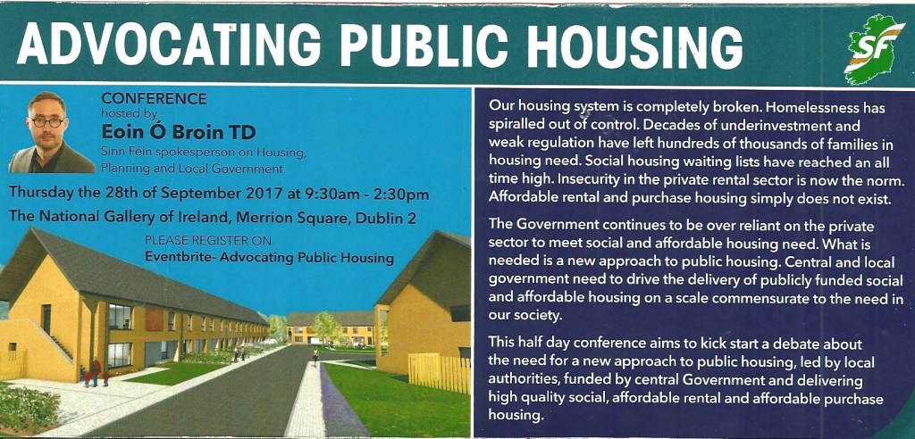 From 2017 a leaflet advertising a Conference on Advocating Public Housing hosted by Eoin Ó Broin of Sinn Féin