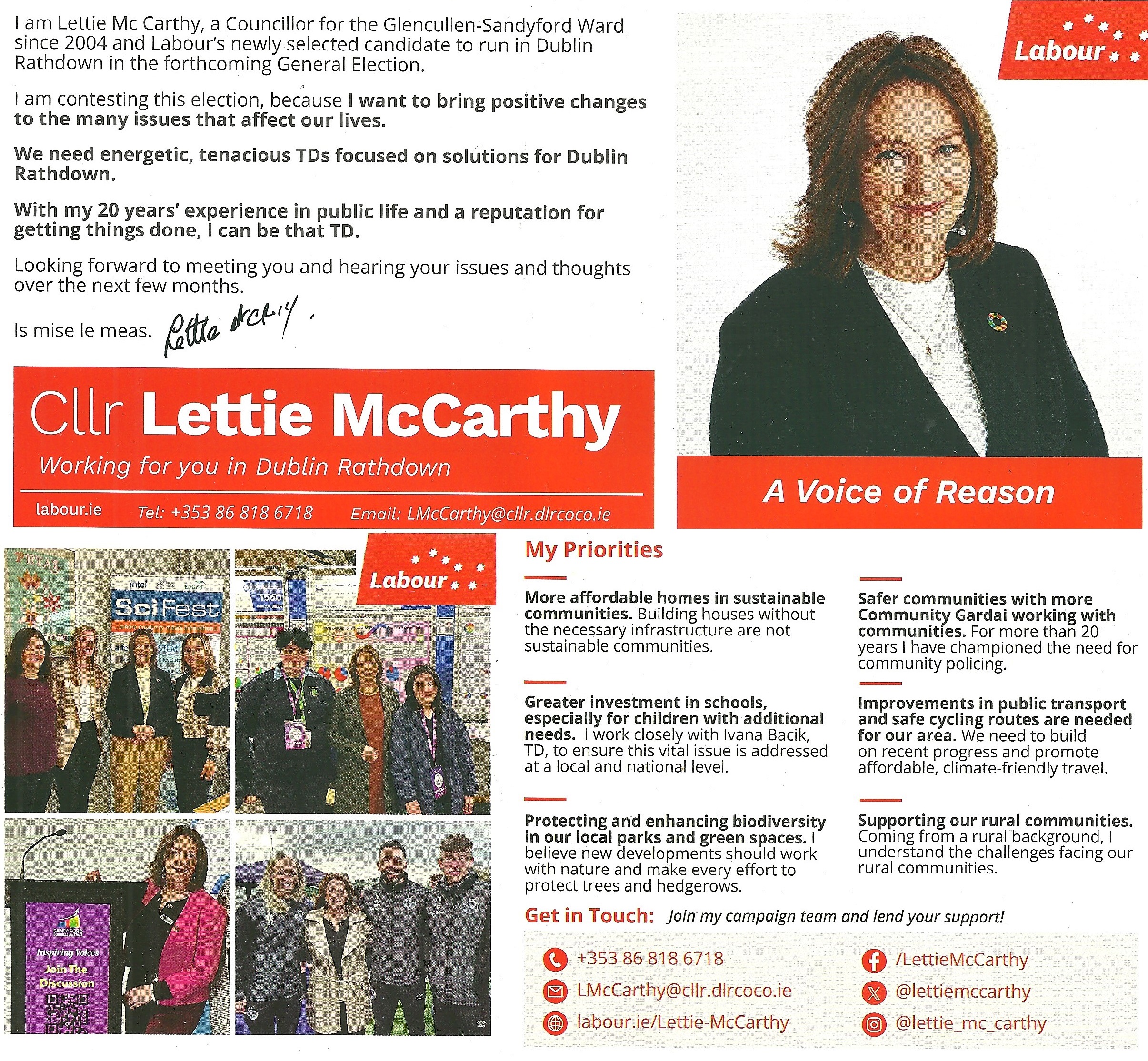 A leaflet from Lettie McCarthy who is running for The Labour Party in Dublin Rathdown in the 2024 General Election.