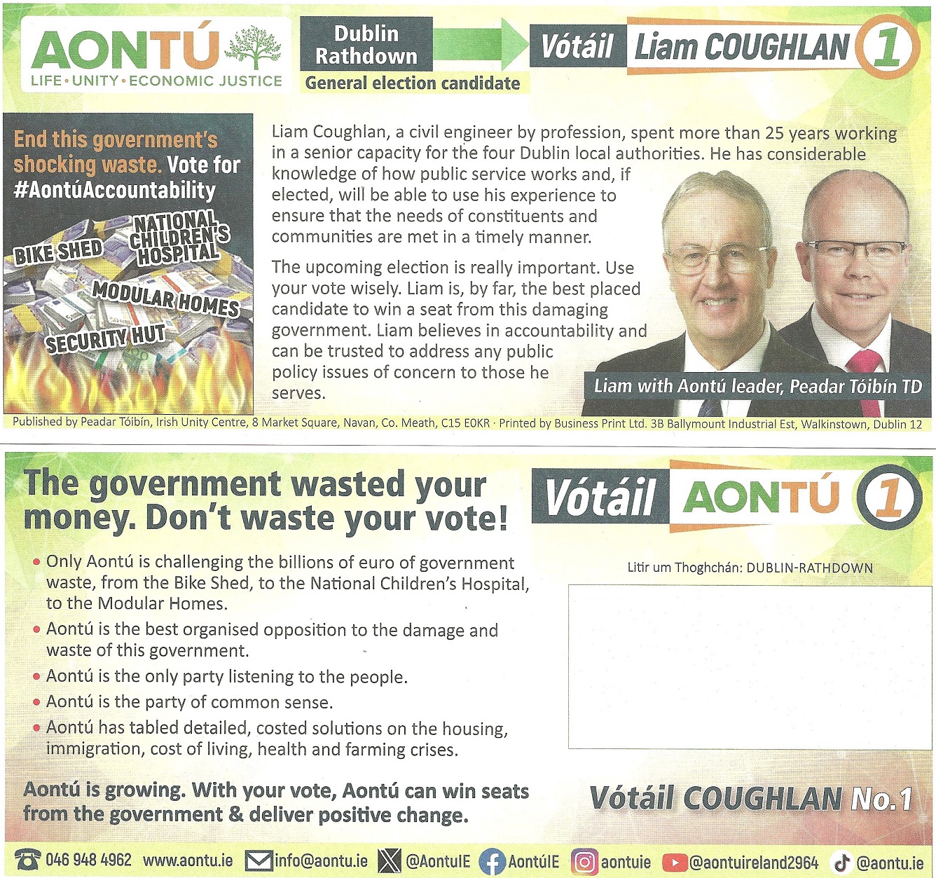 A Leaflet from Liam Coughlan who is running for Aontú in Dublin Rathdown in the 2024 General Election