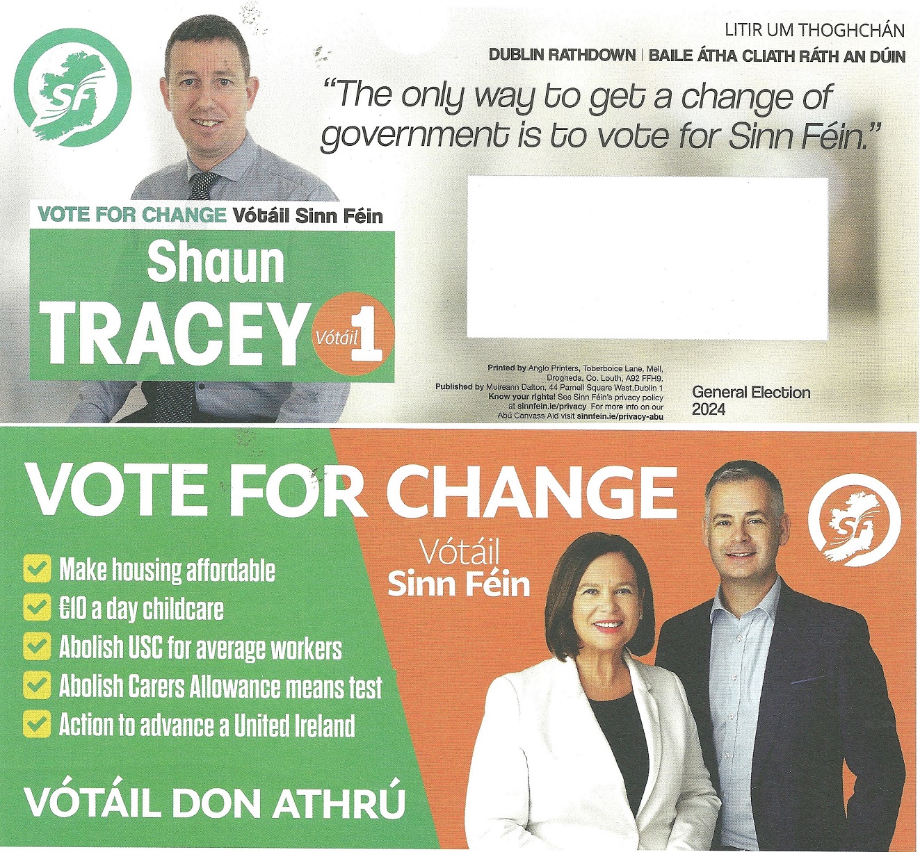 A Leaflet from Shaun Tracey who is running for Sinn Féin in Dublin Rathdown in the 2024 General Election