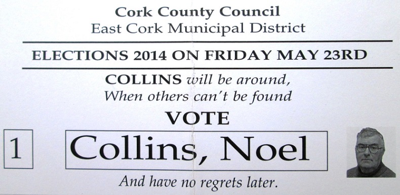“Collins will be around when others can’t be found” -flyer from Noel Collins -Independent -East Cork May 15, 2014
