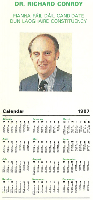 From the run up to the 1987 General Election a Leaflet with Calendar and New Years Message from Fianna Fail Dun Laoghaire candidate Richard Conroy. Conroy had four previous attempts running for Fianna Fail in General Elections and had failed to win a seat. Here in 1987 he polled 2897 votes and again missed out. (His record at Electionsireland.org).