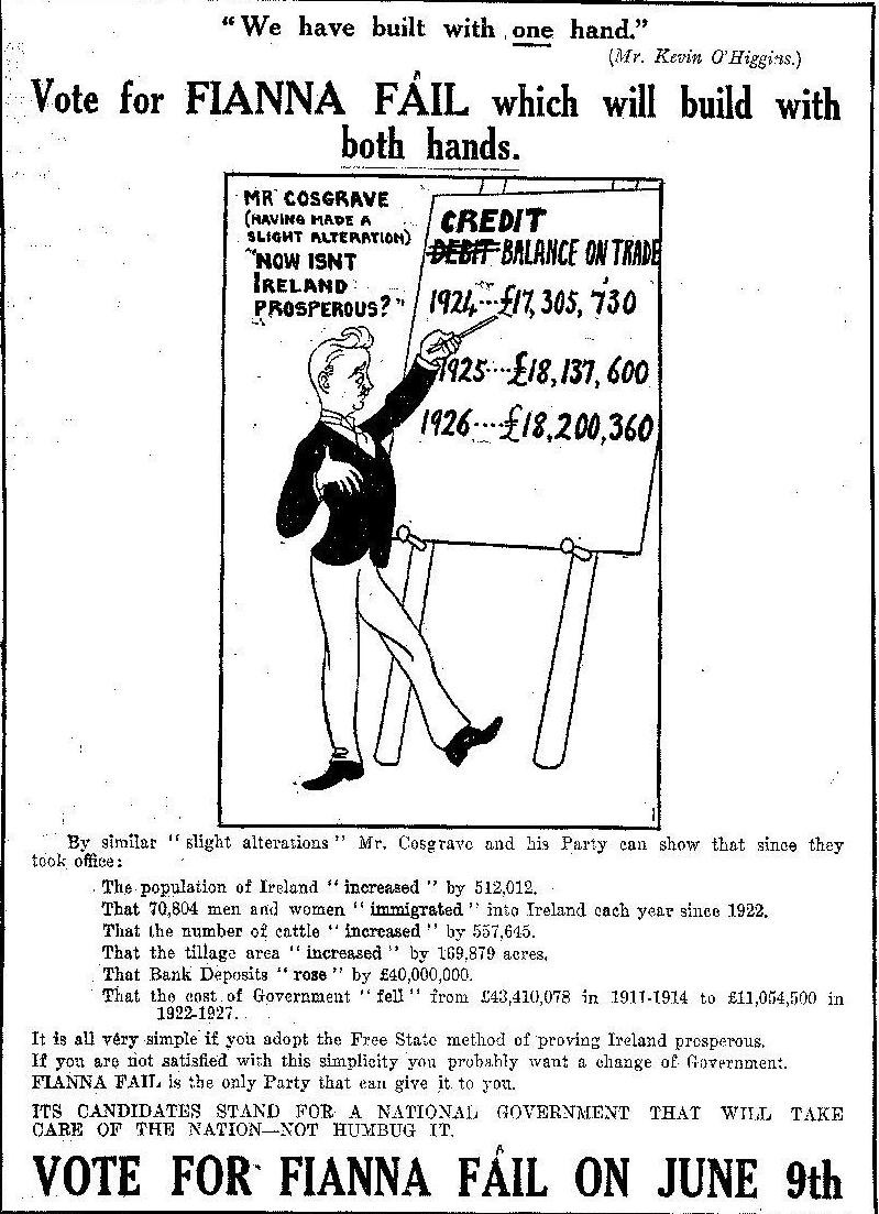 A 1927 ad for Fianna Fail criticising the Cosgrave government. Towards the end of the ad there is the line “Fianna Fail is the only Party that can give it to you”.