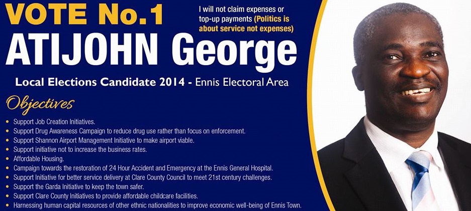 A flyer from Felix Omorodion who is running as an Independent in Ennis for a seat on Clare County Council.
