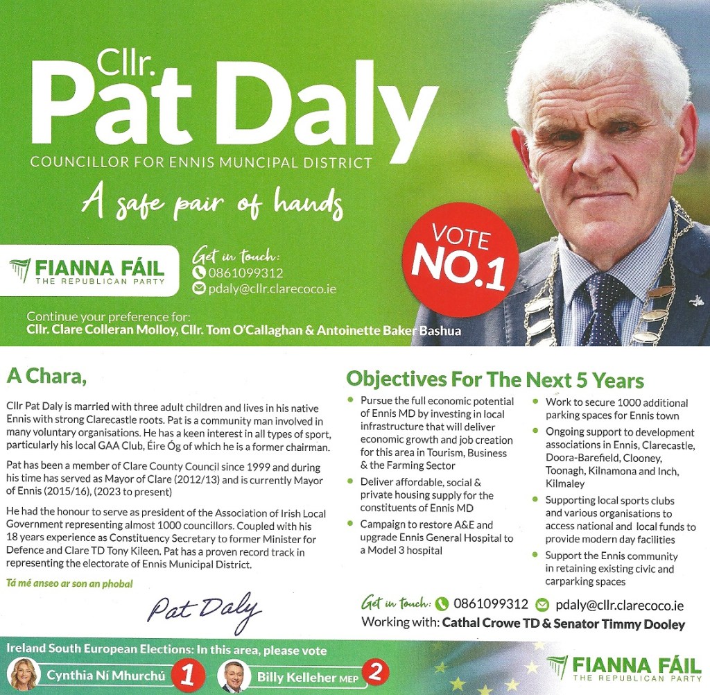 A leaflet form Pat Daly who is running for Fianna Fáil in Ennis in the 2024 Local Elections