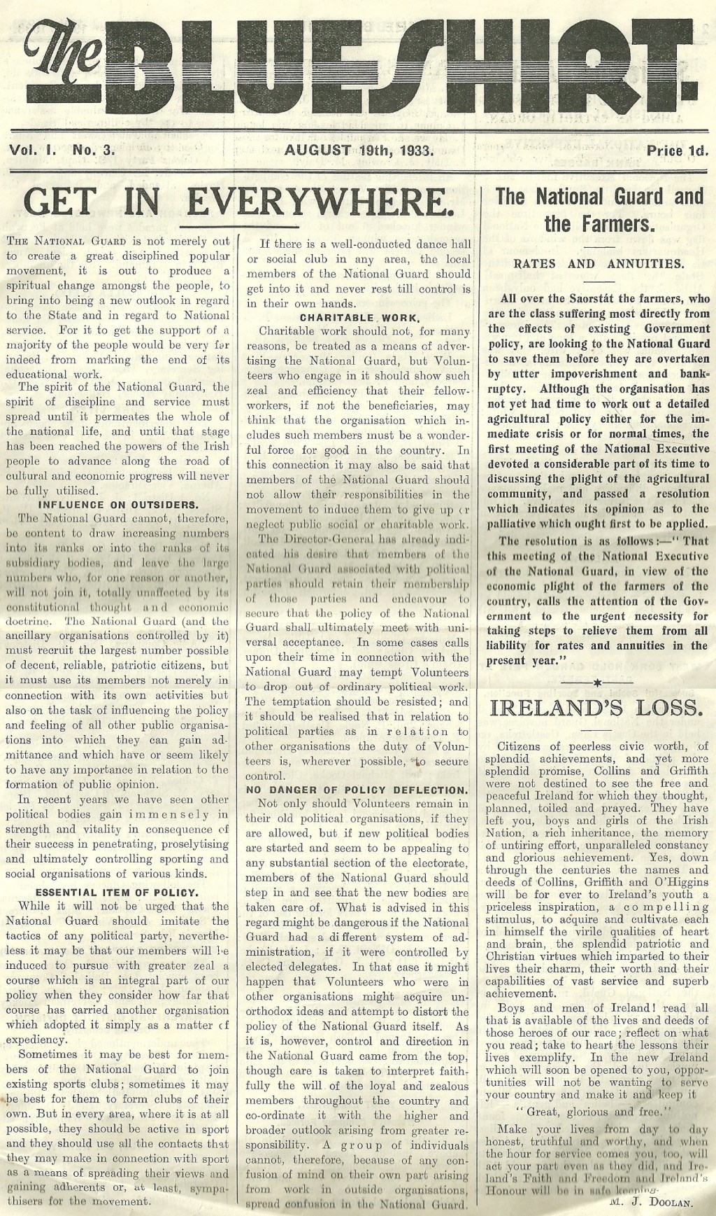 “The Blueshirt” the paper of the National Guard , also known as the Blueshirts from August 19th , 1933. Has details of the groups activity, the rules of the group and so on. A really interesting piece of Irish History. (apologies that it’s not in pdf but the paper was too big for my scanner, so had to scan by half pages and then reunite the pages)