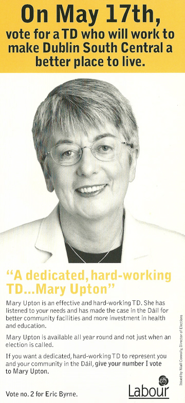 From the run up to the 2002 General Election “Bin The Charges!” a leaflet from Eric Byrne of Labour who was running in Dublin South Central. He polled 4,159 votes and lost out on a seat.