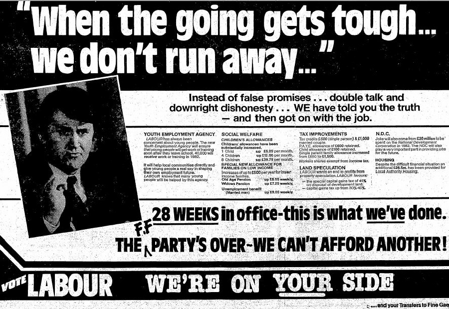 I really love this Labour Ad from the February 1982 General Election its so full of irony. A big headline “When the going gets tough … we don’t run away” with a picture of then Labour Party leader Michael O’Leary. Nine months later he had resigned as Labour Party leader and joined Fine Gael!!