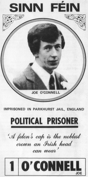 From the February 1982 General Election a leaflet from Sinn Fein candidate Joe O’Connell running in Clare. O’Connell, then a prisoner in Parkhurst Jail polled 1,233 votes.