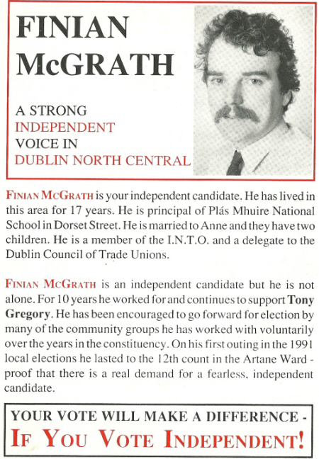 Finian McGrath from his first General Election in 1992 where he gained 764 votes. His vote in the 1997 GE increased and in 1999 he won a seat on Dublin City Council.