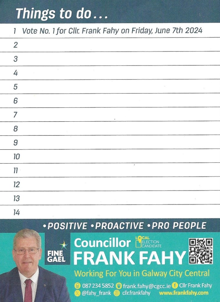 A small notepad with a list of ‘things to do’ from Frank Fahy of Fine Gael who is running in Galway City Central in the 2024 Local Elections