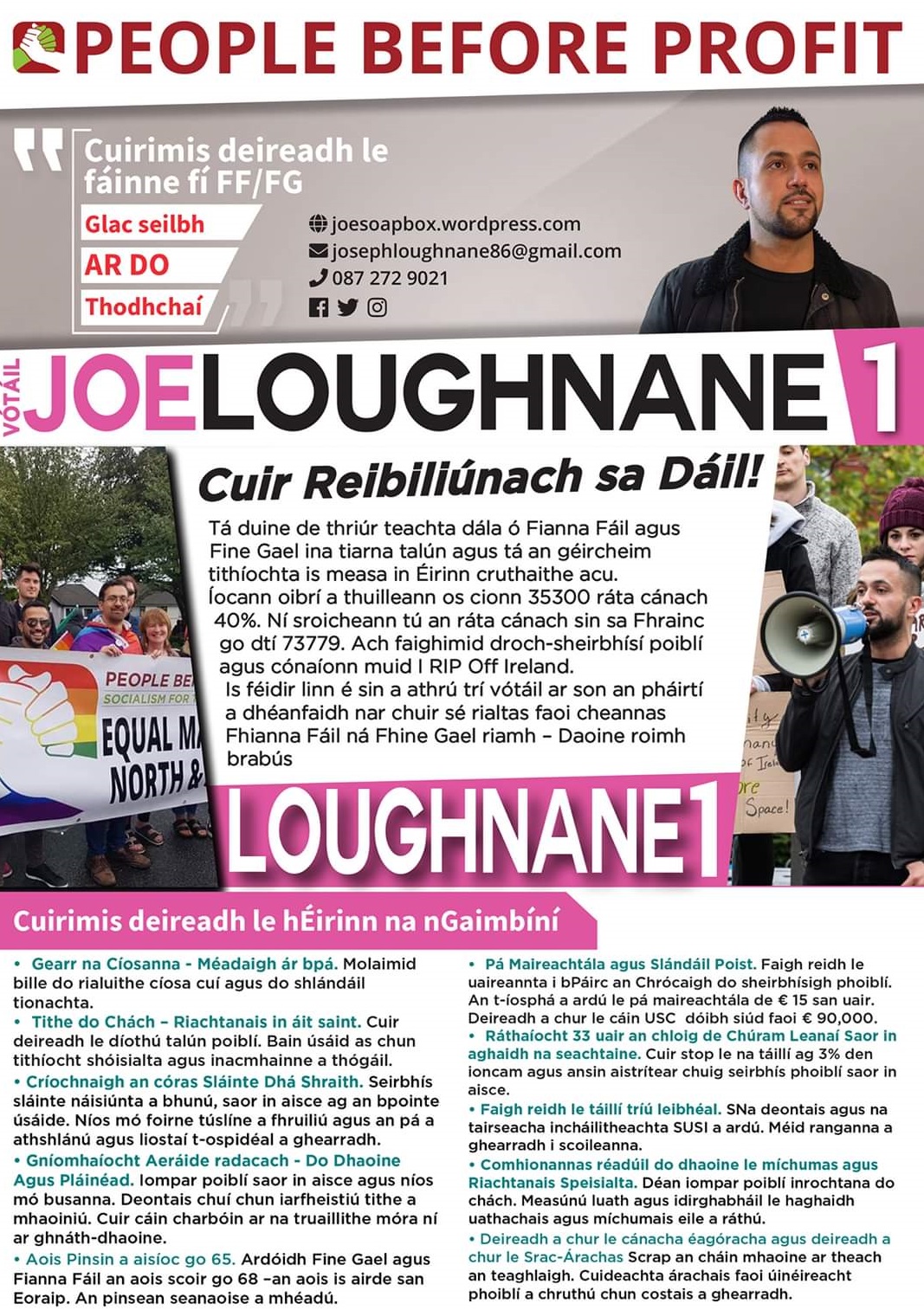 Bileog ó Joe Loughnane ó People Before Profit is iarrthóir i nGaillimh Thiar.