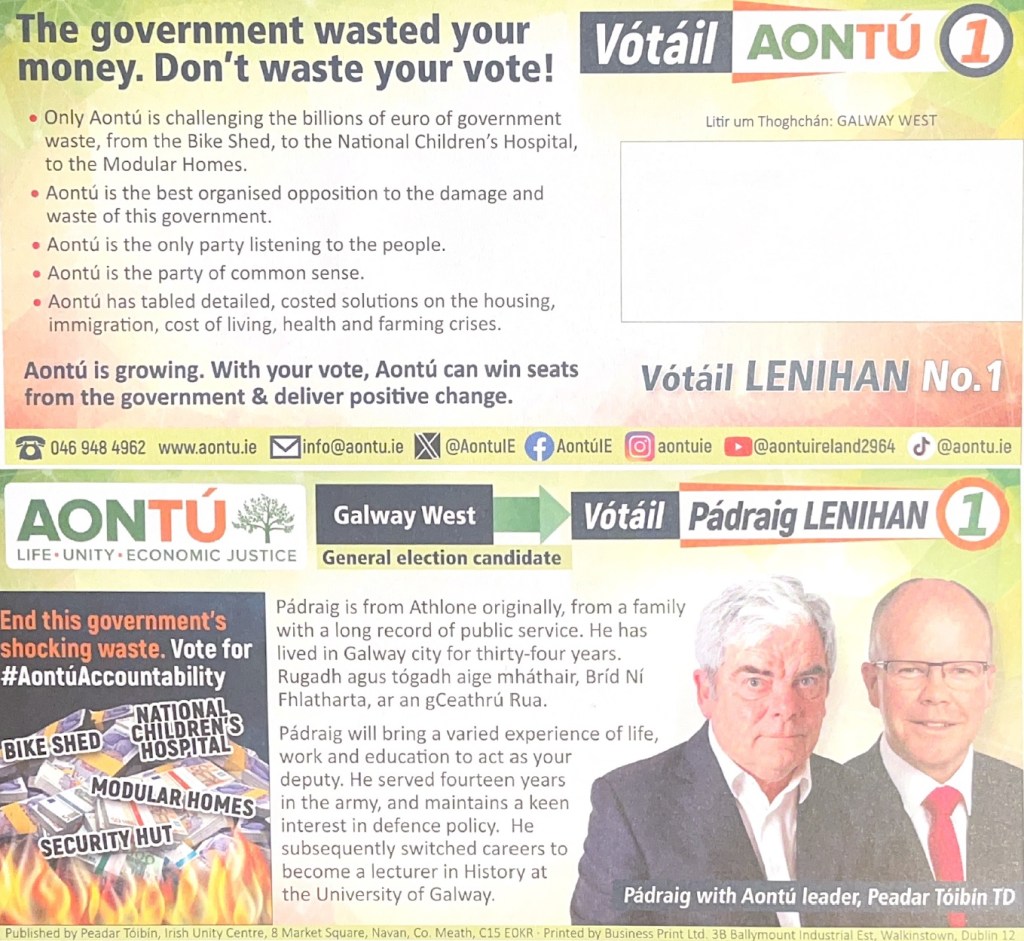 A Leaflet from Pádraig Lenihan who is running for Aontú in Galway West in the 2024 General Election