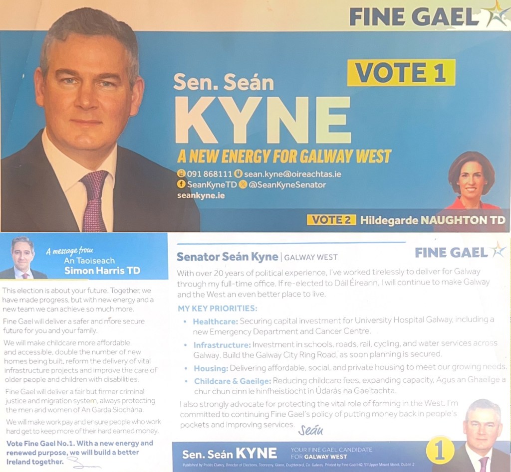 A leaflet from Seán Kyne who is running for Fine Gael in Galway West in the 2024 General Election