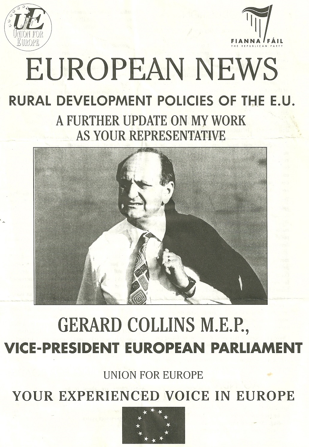 From the 1994 European Elections a leaflet from Fianna Fail Limerick based TD Gerry Collins running in Munster. Collins was elected on this his first attempt at winning a seat in the European Parliament.