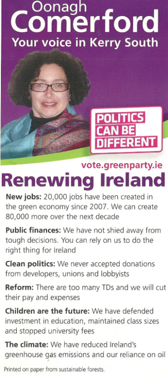 From the 2011 General Election a leaflet from Green Party candidate in Kerry South Oonagh Comerford. Comerford polled 401 votes and failed to win a seat.